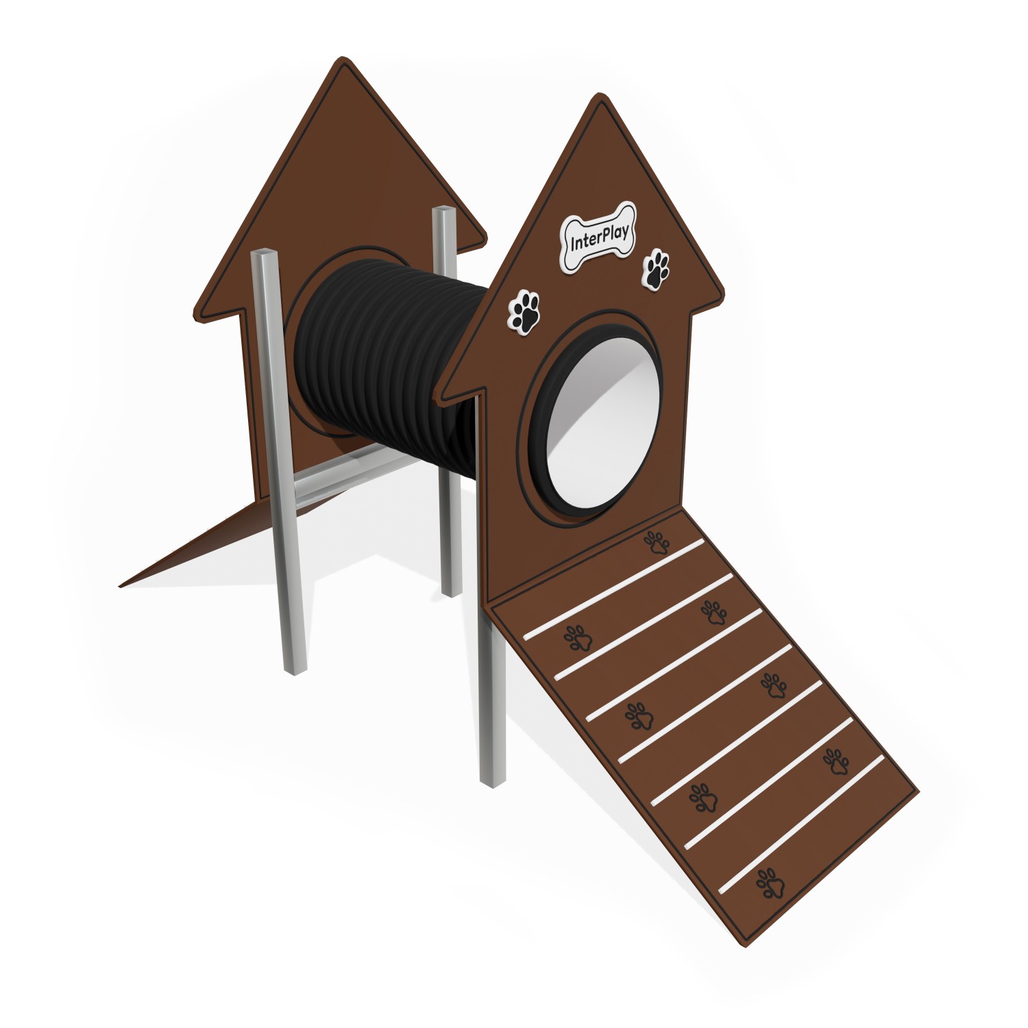 Dog Agility 2 Psiasteczko to zestaw treningowy stworzony z myślą o maksymalnej trwałości, bezpieczeństwie i komforcie użytkowania. Solidna konstrukcja wykonana jest ze stali czarnej ocynkowanej ogniowo, co zapewnia wysoką odporność na warunki atmosferyczne. Zestaw składa się z 4 nóg fundamentowych, 1 tunelu, 2 ścianek z dekorami po obu stronach tunelu oraz dwóch ścianek do wejścia/zejścia. Ścianki zestawu wykonane z tworzywa HDPE o grubości 15 mm. Schodki antypoślizgowe z płyty HPL hex o grubości 10 mm oraz dekory wykonane z tworzywa HDPE o grubości 15 mm.