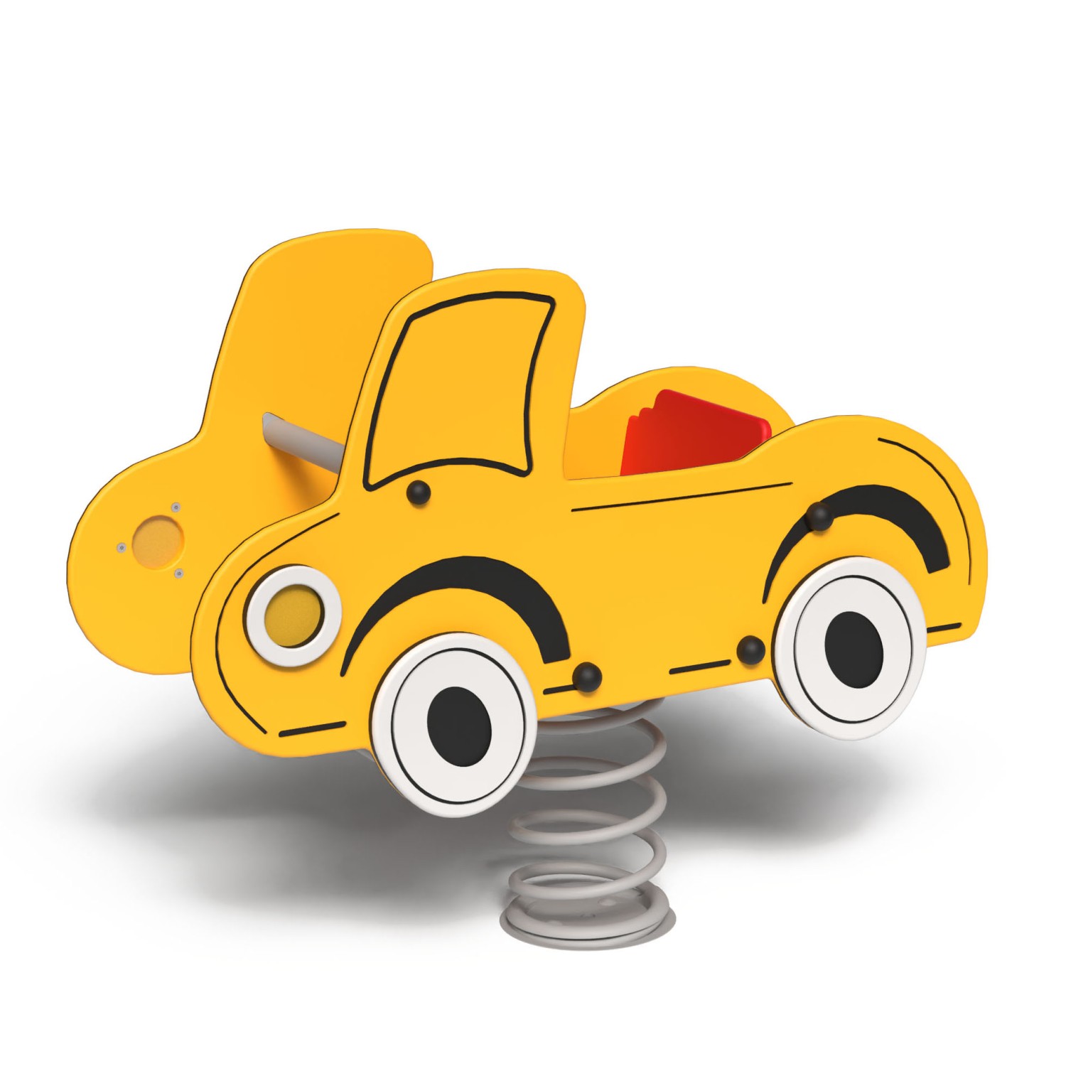 Bujak sprężynowy Autka został zaprojektowany z myślą o trwałości, bezpieczeństwie i funkcjonalności. Konstrukcja wykonana ze stali S235 ocynkowanej ogniowo i malowanej proszkowo, rury o średnicy 33,7 mm oraz grubości ścianki 2 mm. Dekory oraz siedzisko z oparciem wykonane z tworzywa HDPE o grubości 15 mm. Poprzeczny uchwyt oraz podnóżek w kolorze czarnym wykonane z polipropylenu.