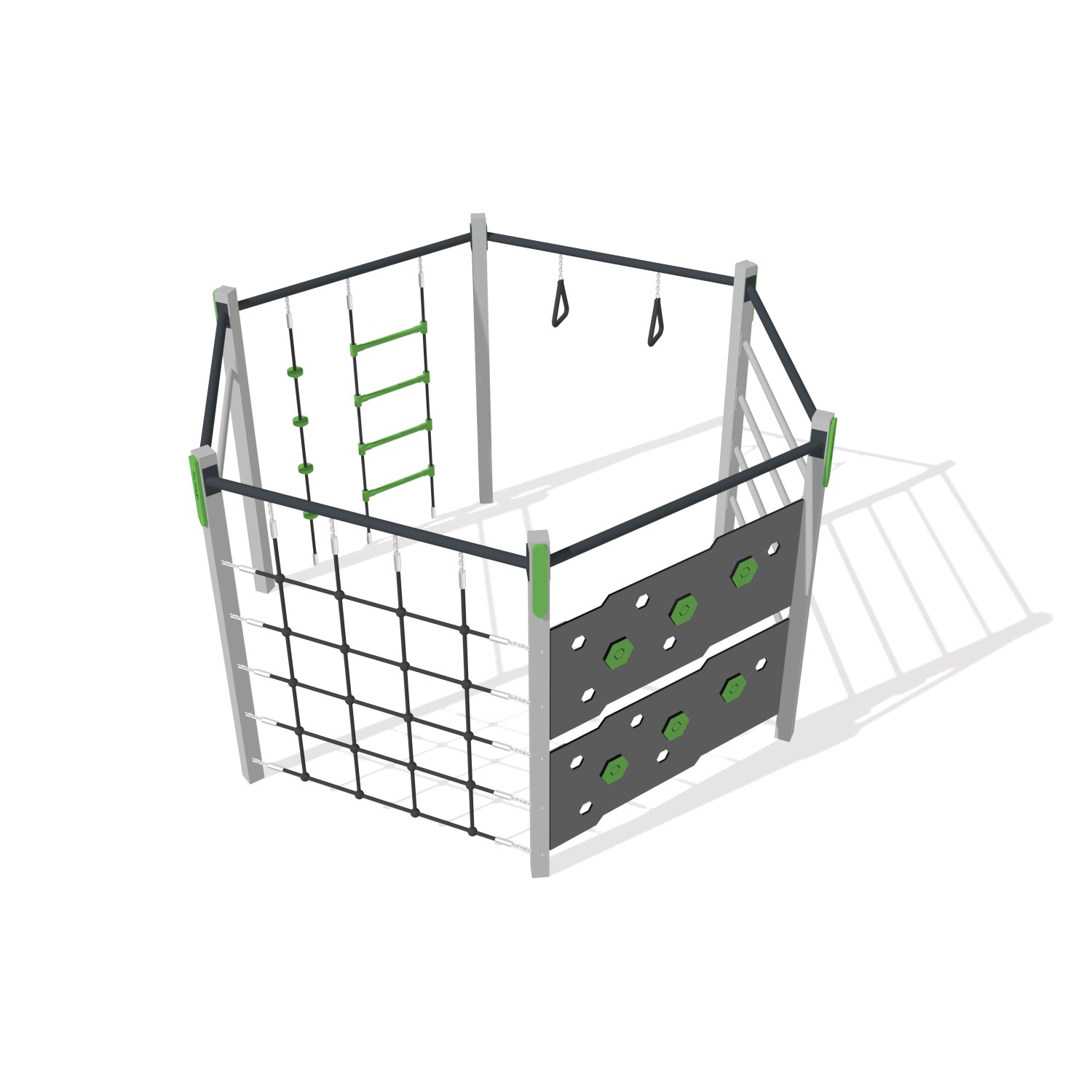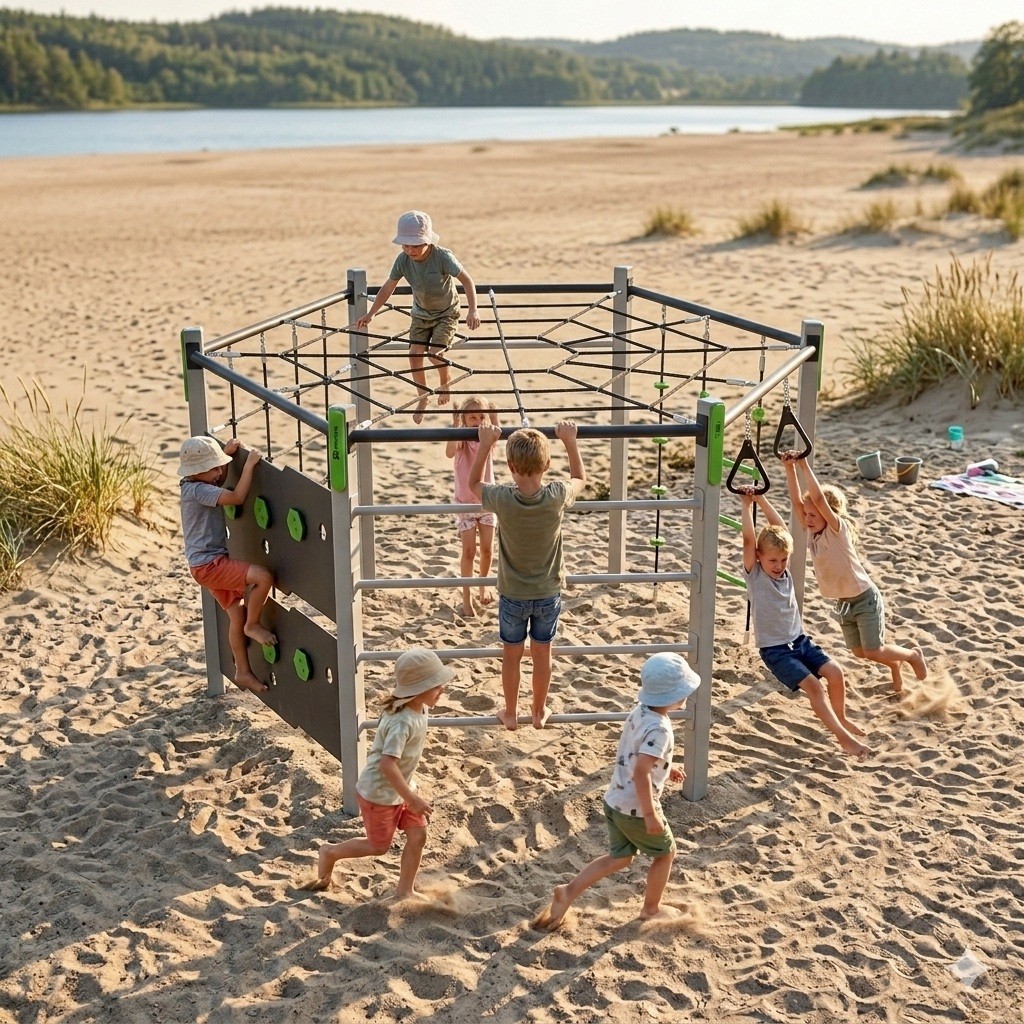 Zestaw Movilo 2 to nowoczesny sześciokąt wspinaczkowy, który zachęca dzieci do aktywnej zabawy i rozwijania sprawności fizycznej. Konstrukcja łączy w sobie różnorodne elementy do wspinaczki, podciągania i ćwiczeń koordynacyjnych, takie jak drabinki linowe, ścianki wspinaczkowe, siatka oraz uchwyty gimnastyczne. Dzięki temu dzieci mogą rozwijać siłę, równowagę oraz zręczność podczas bezpiecznej i angażującej zabawy. Solidna stalowa konstrukcja zapewnia trwałość i odporność na intensywne użytkowanie oraz zmienne warunki atmosferyczne. Nowoczesny design i uniwersalna forma sprawiają, że zestaw doskonale sprawdzi się na placach zabaw, w parkach, szkołach czy przestrzeniach rekreacyjnych. To idealne rozwiązanie, które łączy aktywność fizyczną z radością zabawy na świeżym powietrzu!