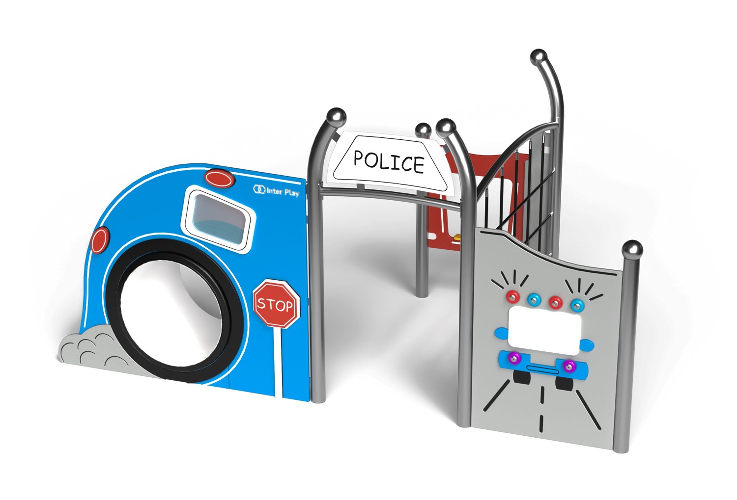 Zestaw Posterunek Policji to wyjątkowy element placu zabaw, który łączy naukę z kreatywnym odgrywaniem ról, przystosowany dla dzieci poruszających się na wózkach inwalidzkich. Dzieci mogą stać się policjantami, wyruszać na patrol, reagować na „wezwania” i rozwijać wyobraźnię, koordynację ruchową oraz umiejętność współpracy. Zestaw przyciąga realistycznym wyglądem – bramą z napisem „POLICE”, posterunkowym panelem z ladą, tunelem, ściankami wspinaczkowymi oraz radiowozem. Wykonany z trwałych i bezpiecznych materiałów, stanowi centrum zabawy i symbol przygody na każdym placu zabaw. Dodatkowo wbudowane kółka emitujące barwne światło w ruchu sprawiają, że dziecięca zabawa staje się jeszcze bardziej ekscytująca. Zestaw idealny do przedszkoli, stref rekreacyjnych i na place zabaw, wspiera rozwój sensoryczny i pobudza kreatywność najmłodszych.