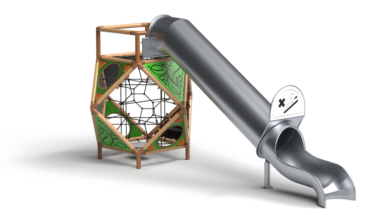 Zestaw Sfero Forest 1-2 składa się z jednej kuli sferycznej oraz jednej prostej, tubowej zjeżdżalni. Kula jest bryłą Archimedesowską i dzięki swojej ośmiokątnej symetrii oraz promieniowo równobocznej konstrukcji stanowi niezwykle stabilną strukturę, która zapewnia najwyższy poziom bezpieczeństwa użytkowników. Kula sferyczna posiada 24 identyczne krawędzie, które tworzą rury konstrukcyjne wykonane ze stali konstrukcyjnej o średnicy 88,9 mm oraz grubości ścianki 2,6 mm ocynkowane ogniowo oraz pomalowane proszkowo. Elementy konstrukcyjne kuli sferycznej połączone są ze sobą w innowacyjny sposób za pomocą wewnętrznych tulei łączących, które umożliwiają solidne połączenie elementów - dzięki temu konstrukcja zachowuje stabilność nawet przy intensywnej zabawie 18 dzieci.