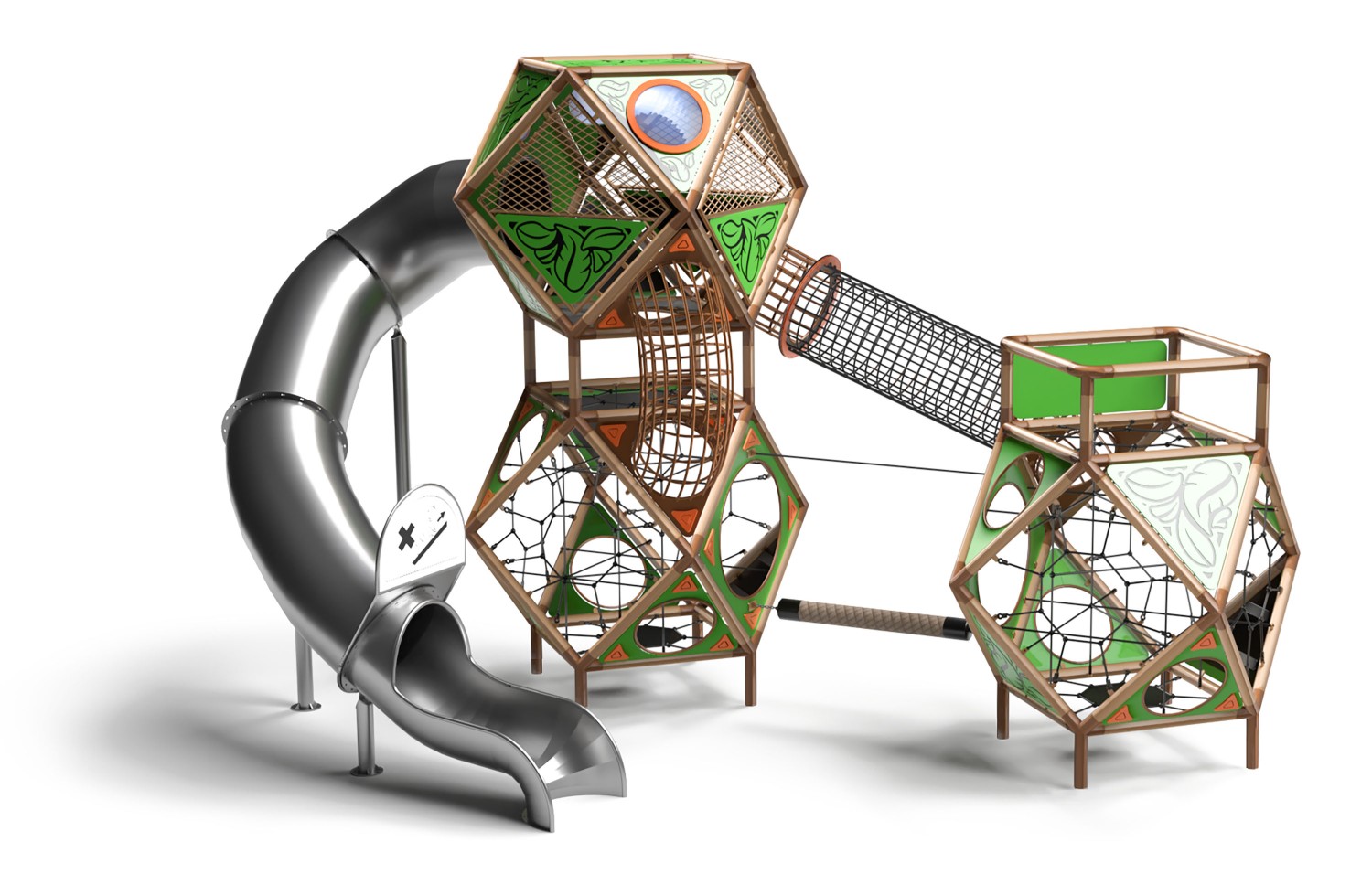Zestaw Sfero Forest 3-1 składa się z trzech połączonych ze sobą kul sferycznych oraz jednej długiej, tubowej zjeżdżalni. Każda kula jest bryłą Archimedesowską i dzięki swojej ośmiokątnej symetrii oraz promieniowo równobocznej konstrukcji stanowi niezwykle stabilną strukturę, która zapewnia najwyższy poziom bezpieczeństwa użytkowników. Pojedyncza kula sferyczna posiada 24 identyczne krawędzie, które tworzą rury konstrukcyjne wykonane ze stali konstrukcyjnej o średnicy 88,9 mm oraz grubości ścianki 2,6 mm ocynkowane ogniowo oraz pomalowane proszkowo. Elementy konstrukcyjne kul sferycznych połączone są ze sobą w innowacyjny sposób za pomocą wewnętrznych tulei łączących, które umożliwiają solidne połączenie elementów - dzięki temu konstrukcja zachowuje stabilność nawet przy intensywnej zabawie 39 dzieci.