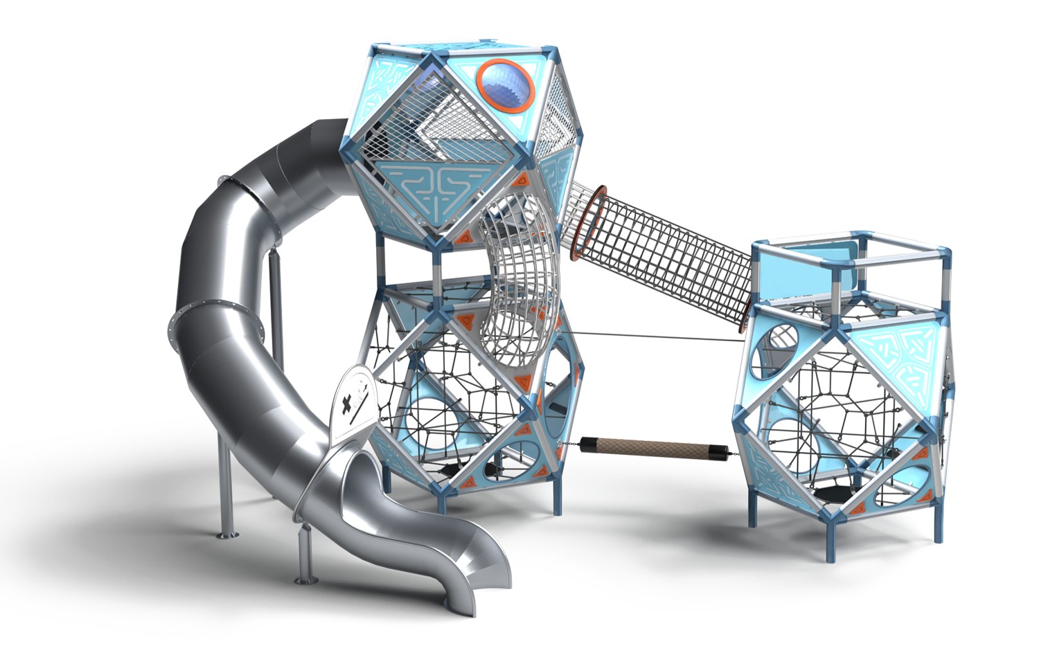 Zestaw Sfero Space 3-1 składa się z trzech połączonych ze sobą kul sferycznych oraz jednej długiej, tubowej zjeżdżalni. Każda kula jest bryłą Archimedesowską i dzięki swojej ośmiokątnej symetrii oraz promieniowo równobocznej konstrukcji stanowi niezwykle stabilną strukturę, która zapewnia najwyższy poziom bezpieczeństwa użytkowników. Pojedyncza kula sferyczna posiada 24 identyczne krawędzie, które tworzą rury konstrukcyjne wykonane ze stali konstrukcyjnej o średnicy 88,9 mm oraz grubości ścianki 2,6 mm ocynkowane ogniowo oraz pomalowane proszkowo. Elementy konstrukcyjne kul sferycznych połączone są ze sobą w innowacyjny sposób za pomocą wewnętrznych tulei łączących, które umożliwiają solidne połączenie elementów - dzięki temu konstrukcja zachowuje stabilność nawet przy intensywnej zabawie 39 dzieci.