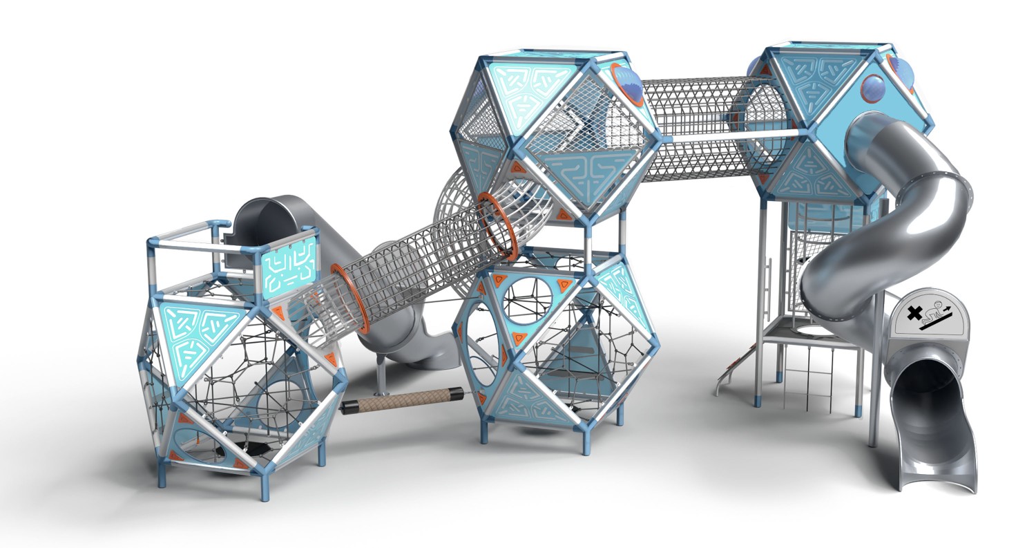 Zestaw Sfero Space 4-1 składa się z czterech połączonych ze sobą kul sferycznych oraz z jednej prostej, tubowej i jednej krętej, tubowej zjeżdżalni. Każda kula jest bryłą Archimedesowską i dzięki swojej ośmiokątnej symetrii oraz promieniowo równobocznej konstrukcji stanowi niezwykle stabilną strukturę, która zapewnia najwyższy poziom bezpieczeństwa użytkowników. Pojedyncza kula sferyczna posiada 24 identyczne krawędzie, które tworzą rury konstrukcyjne wykonane ze stali konstrukcyjnej o średnicy 88,9 mm oraz grubości ścianki 2,6 mm ocynkowane ogniowo oraz pomalowane proszkowo. Elementy konstrukcyjne kul sferycznych połączone są ze sobą w innowacyjny sposób za pomocą wewnętrznych tulei łączących, które umożliwiają solidne połączenie elementów - dzięki temu konstrukcja zachowuje stabilność nawet przy intensywnej zabawie 60 dzieci.