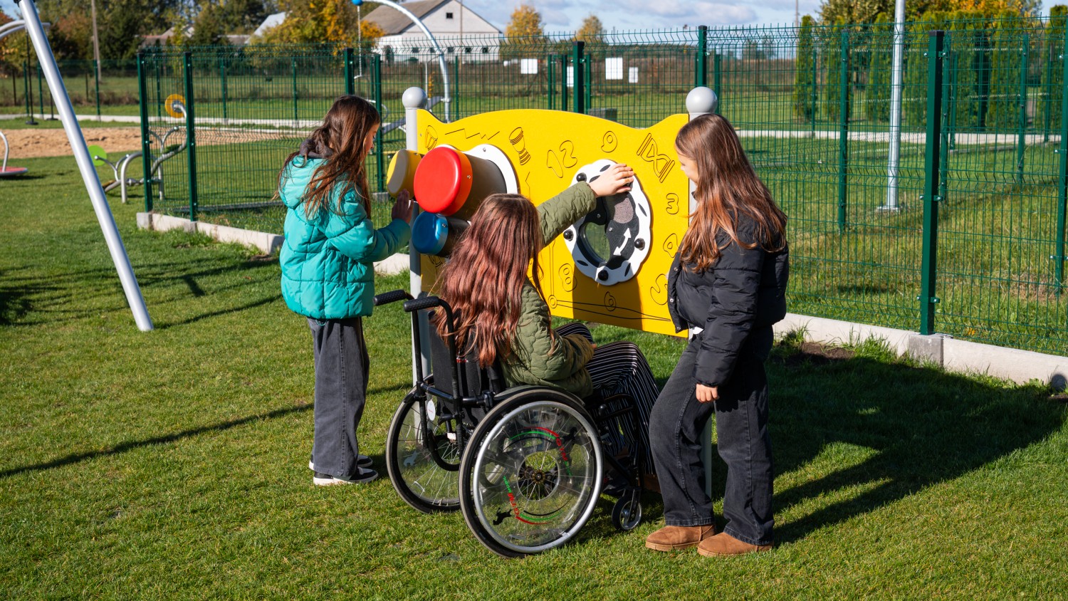 Podwójna tablica sensoryczna przeznaczona do kreatywnej zabawy, przystosowana do użytkowania przez dzieci poruszające się na wózkach inwalidzkich. Zabawka posiada dwa panele: jeden z bongosami, wytrzymałymi na intensywne użytkowanie, wydającymi bardzo dobry jakościowo dźwięk oraz drugi z łatwo obracającym się kołem o 180 stopni, w którym znajduje się klepsydra z kulkami. Czas przesypywania około 30 sekund. Klepsydra oprócz pełnienia funkcji zabawki może służyć również jako określenie czasu w krótkich czynnościach na placu zabaw lub ćwiczeń. Konstrukcja wykonana ze stali czarnej, malowanej proszkowo. Tablica wykonana z tworzywa HDPE. Rury zakończone są kulistymi elementami dekoracyjnymi. Urządzenie posiada certyfikat potwierdzający zgodność z normą PN-EN 1176-1:2017-12 wydany przez jednostkę certyfikującą akredytowaną przez PCA lub równoważną jednostkę zagraniczną. Certyfikat musi być wydany w ramach akredytowanego programu certyfikacji, co potwierdza logotyp PCA lub równoważnej zagranicznej jednostki akredytującej, znajdujący się na certyfikacie. Certyfikat musi być ważny na dzień składania ofert. Do oferty powinien być załączony certyfikat oraz karta techniczna urządzenia. Zamawiający zastrzega sobie prawo żądania przedłożenia ww. certyfikatu i karty technicznej na każdym etapie prowadzonego postępowania o udzielenie zamówienia publicznego. Przedstawiony rysunek produktu stanowi integralną część opisu – produkt musi być zgodny z przedstawionym wyglądem.