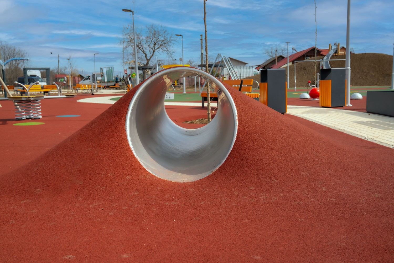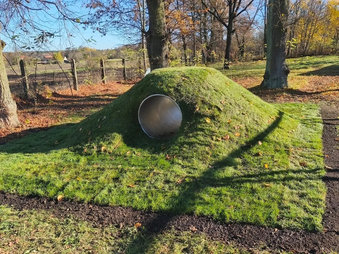 Tunel jest przeznaczony do montażu wewnątrz skarp naturalnych lub formowanych. Ma kształt rury i posiada długość 3,50 m oraz szerokość 0,85 m. Wejście i wyjście jest proste (otwór w kształcie koła prostopadłego względem tunelu). Wykonany jest w całości ze stali nierdzewnej matowionej. Urządzenie posiada certyfikat potwierdzający zgodność z normą PN-EN 1176-1:2017-12 wydany przez jednostkę certyfikującą akredytowaną przez PCA lub równoważną jednostkę zagraniczną. Certyfikat musi być wydany w ramach akredytowanego programu certyfikacji, co potwierdza logotyp PCA lub równoważnej zagranicznej jednostki akredytującej, znajdujący się na certyfikacie. Certyfikat musi być ważny na dzień składania ofert. Do oferty powinien być załączony certyfikat oraz karta techniczna urządzenia. Przedstawiony rysunek produktu stanowi integralną część opisu – produkt musi być zgodny z przedstawionym wyglądem.