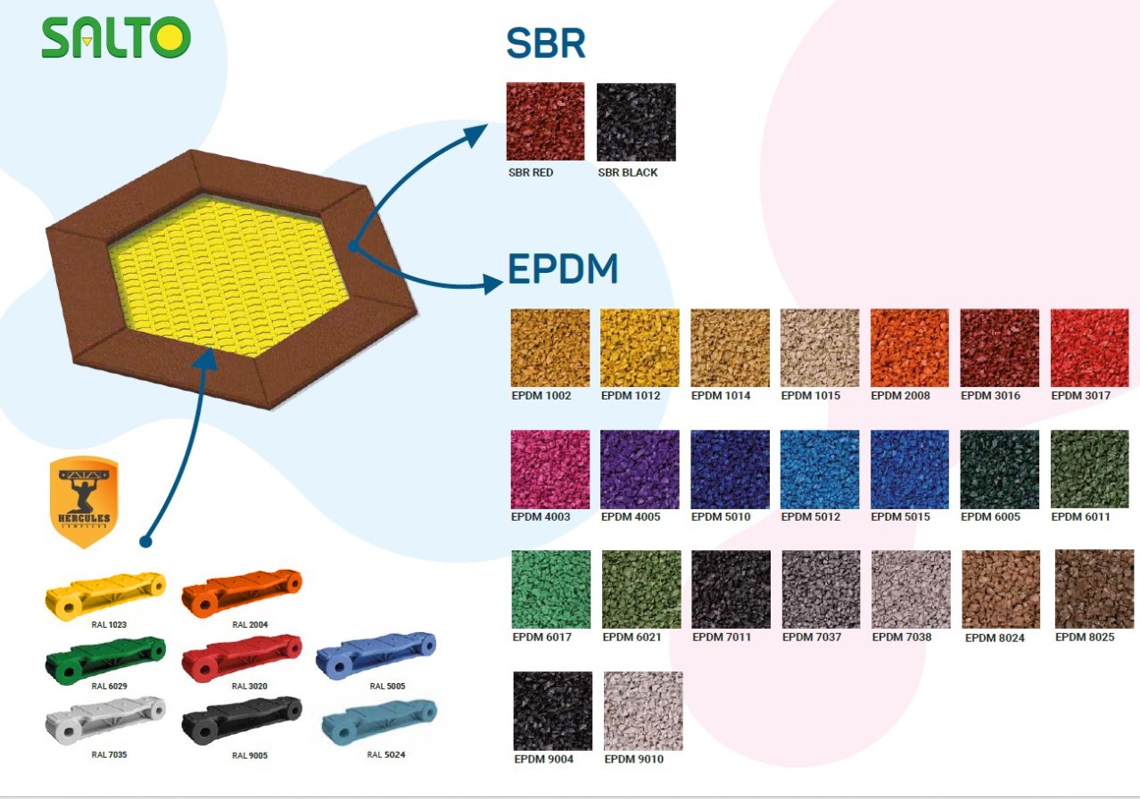 Zestaw 3 trampolin sześciokątnych przeznaczony do stosowania na placach zabaw o intensywnym użytkowaniu.Mata do skakania wykonana jest z bardzo wytrzymałych lamelek Hercules o szerokości min. 37 mm, posiadających kształt litery „V” oraz wzmacniającą kratownicę. Dzięki unikalnemu kształtowi lamelek zmniejszone zostały do zaledwie 7 mm przestrzenie pomiędzy elementami maty co zapobiega wpadnięciu do wnętrza trampoliny drobnych przedmiotów jak np. klucze czy telefony komórkowe. Mata dostępna jest w 8 kolorach, istnieje także możliwość wykonania grafiki na macie - opcja dodatkowo płatna. Gumowy kołnierz trampoliny o grubości 4 cm występuje w 2 kolorach standardowych SBR i 23 kolorach specjalnych EPDM - opcja dodatkowo płatna. Na kołnierzu EPDM można wykonać dekoracyjny wzór. Konstrukcja spawana w postaci sześciokątnej skrzyni wykonanej ze stali ocynkowanej ogniowo. Nie dopuszcza się łączenia elementów skrzyni za pomocą śrub oraz nitów. Trampolina może być wyposażona w podnoszoną pokrywę (opcja dodatkowo płatna), która ułatwia czyszczenie jej wnętrza - skonsultuj ze sprzedawcą. Urządzenie posiada certyfikat potwierdzający zgodność z normą PN-EN 1176-1+A1:2024-03 wydany przez jednostkę certyfikującą akredytowaną przez PCA lub równoważną jednostkę zagraniczną. Certyfikat musi być wydany w ramach akredytowanego programu certyfikacji, co potwierdza logotyp PCA lub równoważnej zagranicznej jednostki akredytującej, znajdujący się na certyfikacie. Certyfikat musi być ważny na dzień składania ofert. Do oferty powinien być załączony certyfikat oraz karta techniczna urządzenia. Zamawiający zastrzega sobie prawo żądania przedłożenia ww. certyfikatu i karty technicznej na każdym etapie prowadzonego postępowania o udzielenie zamówienia publicznego. Przedstawiony rysunek produktu stanowi integralną część opisu – produkt musi być zgodny z przedstawionym wyglądem.
