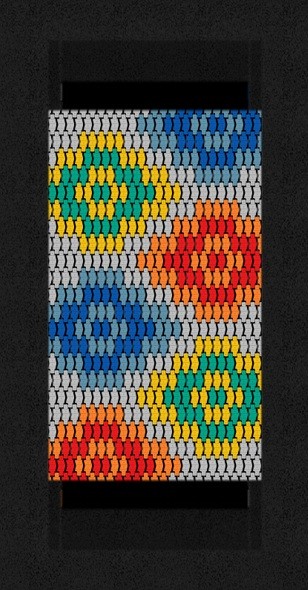 - Mata trampoliny przedstawia kwiatki. Mata jest wykonana z lamelek w kolorze szarym, żółtym, zielonym, pomarańczowym, czerwonym, błękitnym oraz niebieskim,