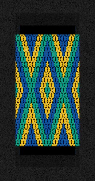 - Mata trampoliny przedstawia wzory dwóch X. Mata jest wykonana z lamelek w kolorze żółtym, zielonym oraz niebieskim,