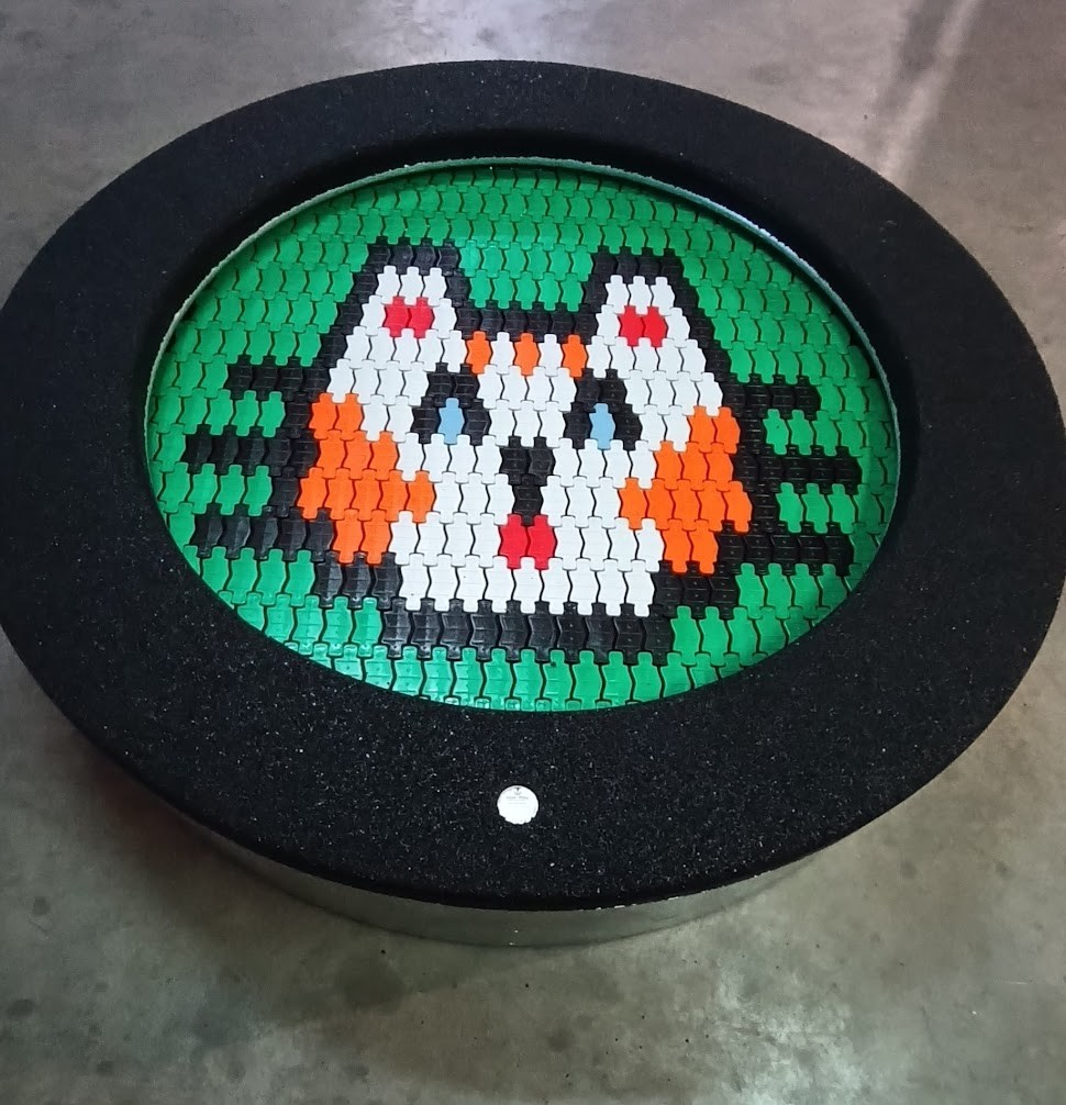 Trampolina okrągła z motywem kotka na macie do skakania przeznaczona do stosowania na placach zabaw o intensywnym użytkowaniu. Mata do skakania wykonana jest z bardzo wytrzymałych lamelek Hercules o szerokości min. 37 mm, posiadających kształt litery „V” oraz wzmacniającą kratownicę. Dzięki unikalnemu kształtowi lamelek zmniejszone zostały do zaledwie 7 mm przestrzenie pomiędzy elementami maty co zapobiega wpadnięciu do wnętrza trampoliny drobnych przedmiotów jak np. klucze czy telefony komórkowe. Mata trampoliny przedstawia wizerunek kotka . Mata jest wykonana z lamelek w kolorze czarnym, pomarańczowym, czerwonym, szarym, zielonym oraz błękitnym. Konstrukcja spawana w postaci okrągłej skrzyni wykonanej z ocynkowanej stali. Nie dopuszcza się łączenia elementów skrzyni za pomocą śrub oraz nitów. Trampolina może być wyposażona w podnoszoną pokrywę, która ułatwia czyszczenie jej wnętrza. Urządzenie posiada certyfikat potwierdzający zgodność z normą PN-EN 1176-1+A1:2024-03 wydany przez jednostkę certyfikującą akredytowaną przez PCA lub równoważną jednostkę zagraniczną. Certyfikat musi być wydany w ramach akredytowanego programu certyfikacji, co potwierdza logotyp PCA lub równoważnej zagranicznej jednostki akredytującej, znajdujący się na certyfikacie. Certyfikat musi być ważny na dzień składania ofert. Do oferty powinien być załączony certyfikat oraz karta techniczna urządzenia. Przedstawiony rysunek produktu stanowi integralną część opisu – produkt musi być zgodny z przedstawionym wyglądem. *Trampolina objęta jest następującą gwarancją: 25 lat na stalową konstrukcję skrzyni oraz 3 lata na lamelki.
