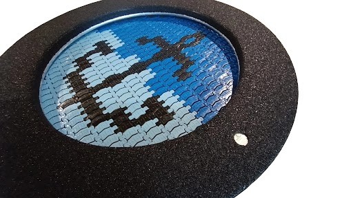 - Mata trampoliny przedstawia wizerunek kotwicy. Mata jest wykonana z lamelek w kolorze szarym, niebieskim oraz żółtym
