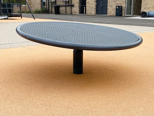 Karuzela o skośnie ustawionej tarczy z funkcją obrotową. Obraca się wykorzystując siłę grawitacji. Tarcza wykonana jest z płyty PE, dzięki czemu jest miękka (bezpieczna), antypoślizgowa (dodatkowa antypoślizgowa faktura) oraz nie ulega nagrzewaniu na słońcu oraz zmrożeniu zimą. Urządzenie posiada certyfikat potwierdzający zgodność z normą EN 1176-1:2017 wydany przez jednostkę certyfikującą akredytowaną przez PCA lub równoważną jednostkę zagraniczną. Certyfikat musi być wydany w ramach akredytowanego programu certyfikacji. Certyfikat musi być ważny na dzień składania ofert. Do oferty powinien być załączony certyfikat oraz karta techniczna urządzenia. Przedstawiony rysunek produktu stanowi integralną część opisu – produkt musi być zgodny z przedstawionym wyglądem.
