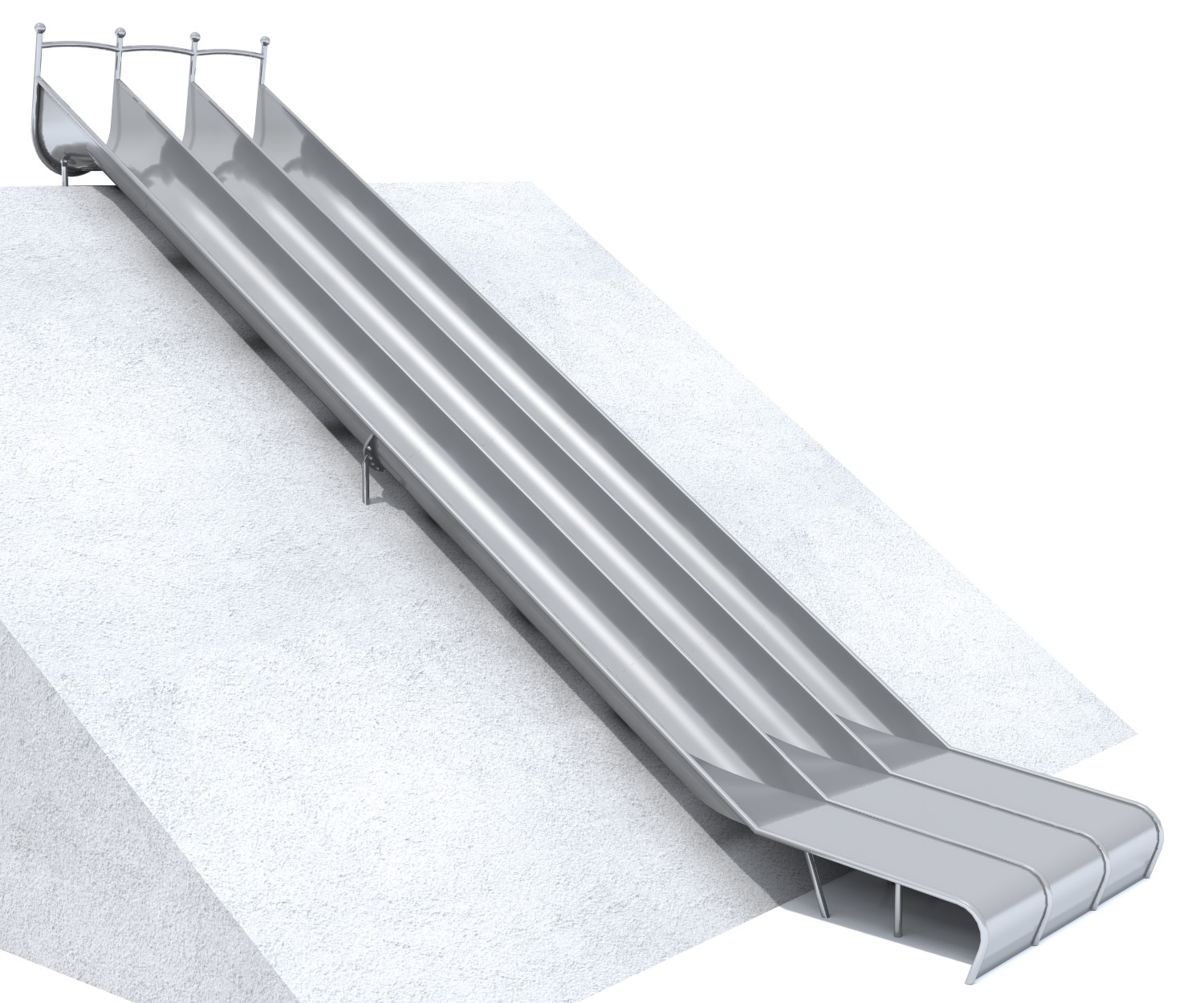 Zjeżdżalnia skarpowa GLITI RACE H3100 składa się z trzech prostych zjeżdżalni w kształcie rynny, pozwalających na równoległy i bezpieczny zjazd. Konstrukcję wspiera szesnaście nóg fundamentowych, wykonanych ze stali nierdzewnej, gwarantującej wysoką wytrzymałość i całkowitą odporność na korozję oraz zapewniających stabilność i trwałość całego urządzenia. Zjeżdżalnia wykonana w całości ze stali nierdzewnej AISI 304 (1.4301), o grubości blachy 2 mm oraz profilu 33,7 x 2 mm; powierzchnia jest szkiełkowana, odporna na warunki atmosferyczne i łatwa w utrzymaniu czystości.