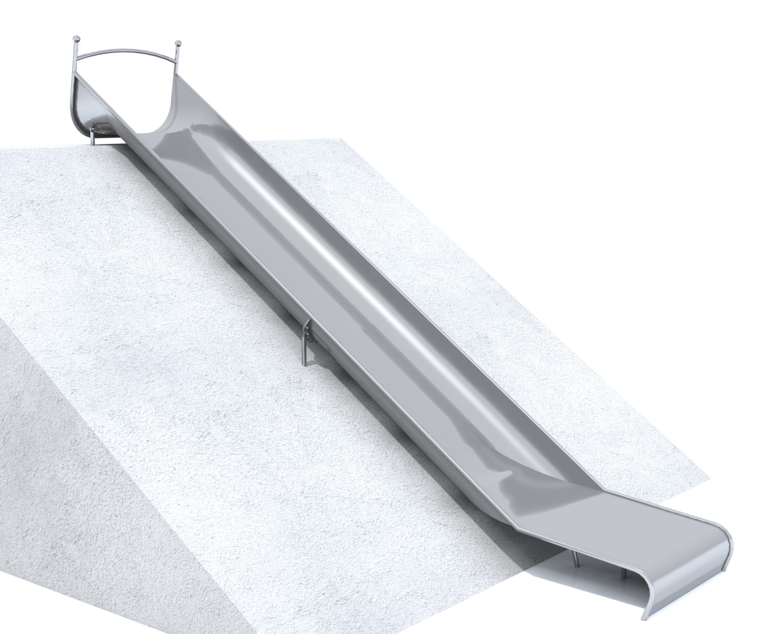 Zjeżdżalnia skarpowa szeroka ELIRI H2750 składa się z prostej zjeżdżalni w kształcie rynny umożliwiającej bezpieczny zjazd. Konstrukcję wspiera 6 nóg fundamentowych, wykonanych ze stali nierdzewnej, gwarantującej wysoką wytrzymałość i całkowitą odporność na korozję oraz zapewniających stabilność i trwałość całego urządzenia. Zjeżdżalnia wykonana jest w całości ze stali nierdzewnej AISI 304 (1.4301), o grubości blachy 2 mm oraz profilu 33,7 x 2 mm; powierzchnia jest szkiełkowana, odporna na warunki atmosferyczne i łatwa w utrzymaniu czystości.