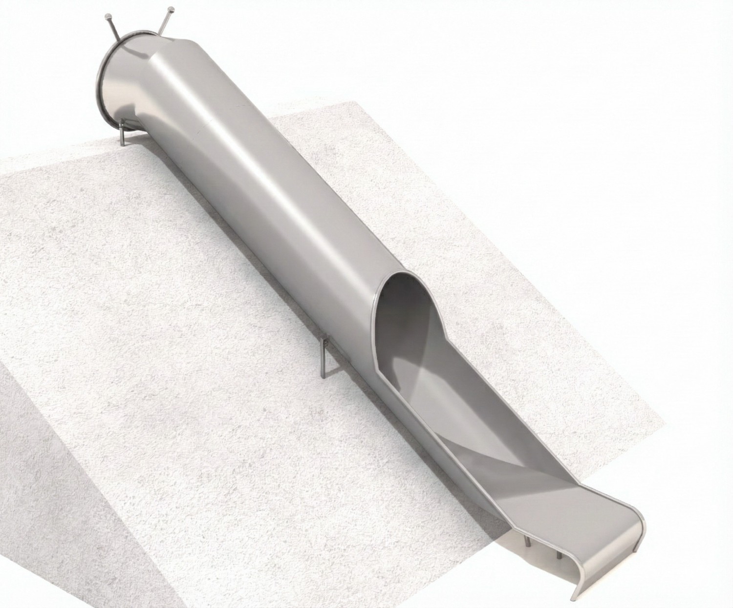 Zjeżdżalnia tubowa TUBO H2400 składa się z prostej zjeżdżalni w kształcie tuby umożliwiającej bezpieczny zjazd. Konstrukcję wspiera 6 nóg fundamentowych, wykonanych ze stali nierdzewnej, gwarantującej wysoką wytrzymałość i całkowitą odporność na korozję oraz zapewniających stabilność i trwałość całego urządzenia. Zjeżdżalnia wykonana jest w całości ze stali nierdzewnej AISI 304 (1.4301), o grubości blachy 2 mm oraz profilu 33,7 x 2 mm; powierzchnia jest szkiełkowana, odporna na warunki atmosferyczne i łatwa w utrzymaniu czystości. Górna część zjeżdżalni wyposażona jest w dwa uchwyty zakończone kulistymi elementami ułatwiające wejście podczas startu.